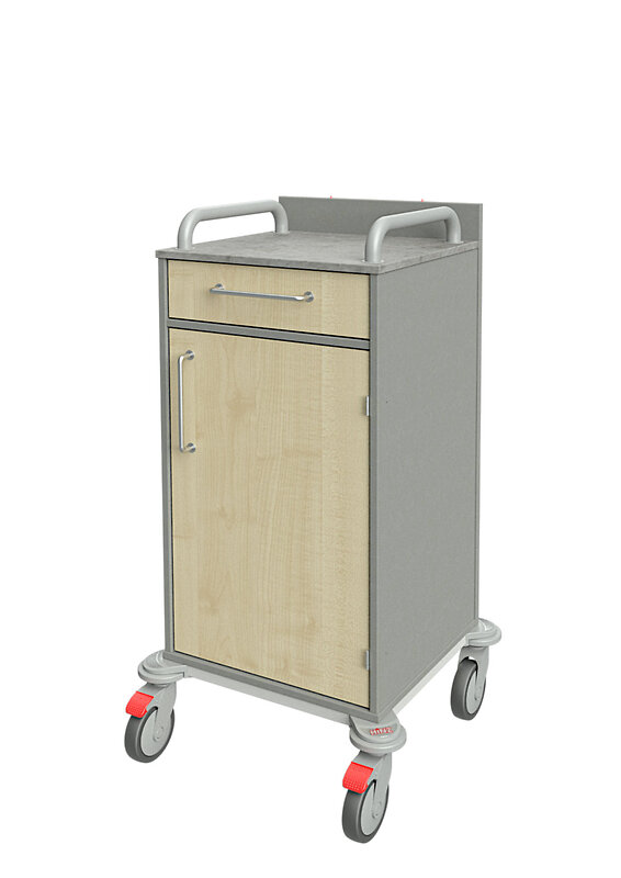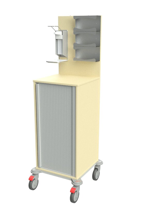 nur 84 cm breiter Wagen mit abschließbarer Schublade und Jalousie, innen ABS-Körbe, Desinfektionsmittelspender, Handschuhboxhalter