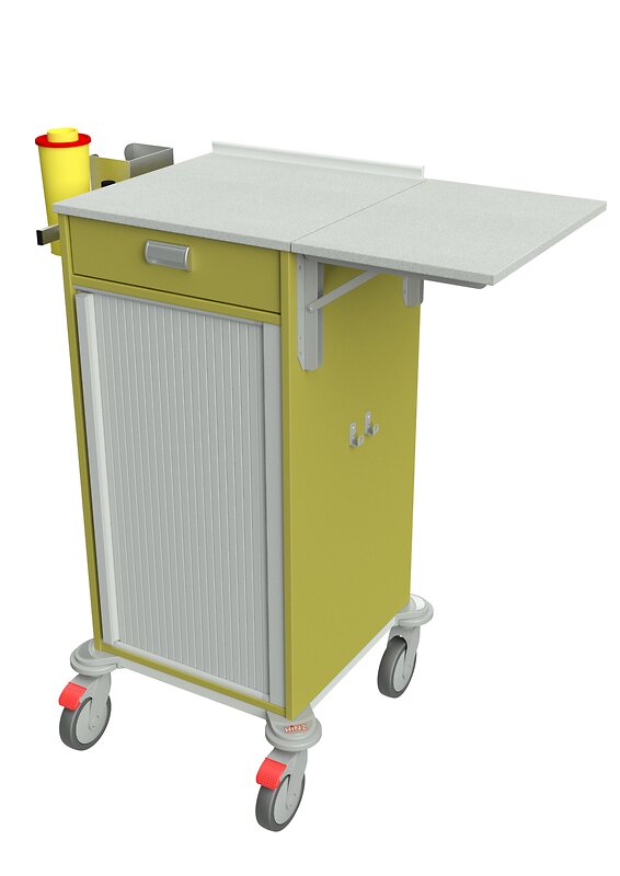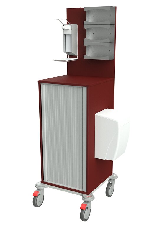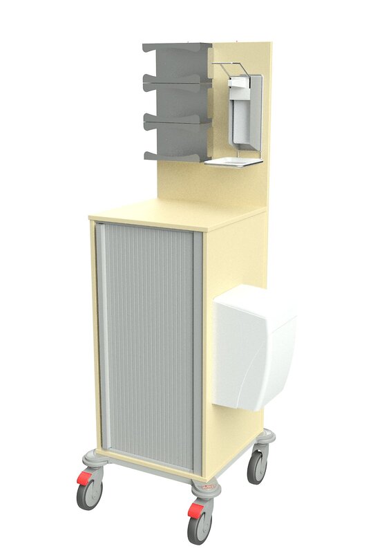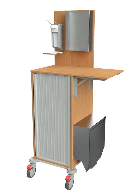 mit Jalousie, Müllbehälter, Desinfektionsmittelspender, Handschuhboxhalter, abklappbarer Schreibplatte, Haken für Körbe und Arbeitsplatte aus ABS mit angeformten Schiebegriffen, innen ABS-Körbe