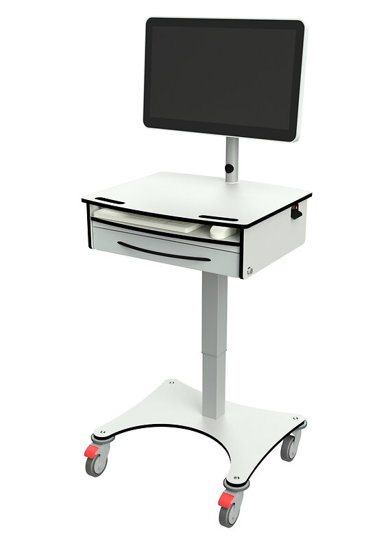 höhenverstellbar, mit All-in-One PC, Auszugsboden mit Tastatur und Maus, 4 Schubladen, Müllbehälter, Desinfektionsmittelspender, Handschuhboxhalter, Halter für Spritzenabwurf, abklappbarer Schreibplatte und Haken für Körbe