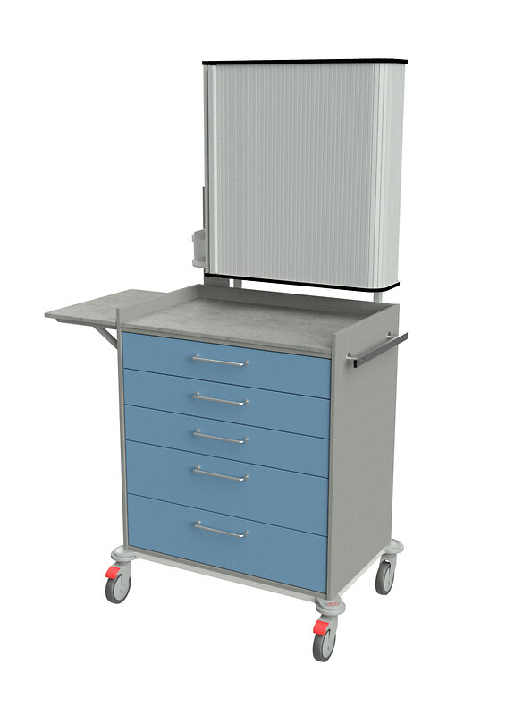 mit 5 zentral verschließbaren Schubladen, Halterung für Spritzenabwurf, Defibrillatorplattform, abklappbarer Schreibplatte, Utensilienkorb, 1x 5er Schütten und 1x 3er Schütten