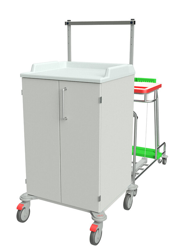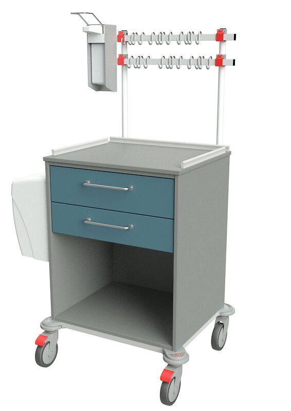 Wagen für Infusionen mit 2 Müllbehältern, 2 Geräteschienen, Desinfektionsmittelspender, 2 Schubladen und einem offenen Fach